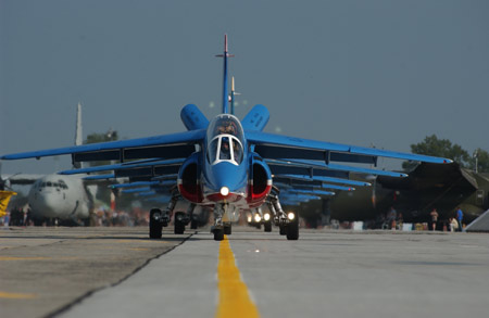 法國空軍的“法蘭西巡邏兵”飛行表演隊(duì)正式成立于1964年2月。飛行表演隊(duì)的飛機(jī)涂著同法國國旗一樣的紅、白、藍(lán)三種顏色,機(jī)群在空中做飛行表演時(shí)也常常把著三種顏色的煙跡留在空中。它象征著“自由”(紅色)、“民主”(白色)、“博愛”(藍(lán)色),體現(xiàn)了法國人民勇敢、浪漫的傳統(tǒng)和對(duì)未來美好的愿望。圖為跑道上排列整齊的飛行隊(duì)表演機(jī)(來源:艦船知識(shí)網(wǎng)絡(luò)版)