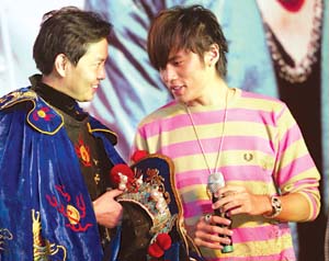 慶功會以京劇《大鬧天宮》開場,各路天王把周杰倫簇?fù)碓谥醒耄[喻“唯周杰倫獨(dú)尊”。隨后,川劇大師彭登懷的弟子上臺伴著《我的地盤》表演了變臉。站在臺側(cè)的周杰倫目不轉(zhuǎn)睛地盯著表演者,然后走到表演者身邊左看右看,最后干脆動手搜起身來。聽到觀眾的笑聲,周杰倫很不好意思地說:“等回家再把老師扒光了查。”