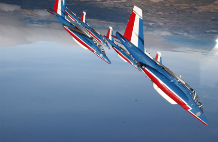 法國空軍的“法蘭西巡邏兵”飛行表演隊正式成立于1964年2月。飛行表演隊的飛機涂著同法國國旗一樣的紅、白、藍三種顏色,機群在空中做飛行表演時也常常把著三種顏色的煙跡留在空中。它象征著“自由”(紅色)、“民主”(白色)、“博愛”(藍色),體現(xiàn)了法國人民勇敢、浪漫的傳統(tǒng)和對未來美好的愿望。圖為飛行員們在高空中做倒飛動作(來源:艦船知識網(wǎng)絡(luò)版)