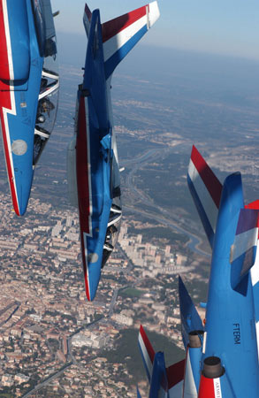 法國空軍的“法蘭西巡邏兵”飛行表演隊正式成立于1964年2月。飛行表演隊的飛機(jī)涂著同法國國旗一樣的紅、白、藍(lán)三種顏色,機(jī)群在空中做飛行表演時也常常把著三種顏色的煙跡留在空中。它象征著“自由”(紅色)、“民主”(白色)、“博愛”(藍(lán)色),體現(xiàn)了法國人民勇敢、浪漫的傳統(tǒng)和對未來美好的愿望。圖為“法蘭西巡邏兵”飛行表演隊作在空中垂直下降動作(來源:艦船知識網(wǎng)絡(luò)版)