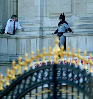 這名抗議者詹森·哈奇,今年32歲,是英國維護(hù)父權(quán)組織“為父親討公道(Fathers 4 Justice)”的一名成員,他扮成蝙蝠俠模樣,闖入女王伊麗莎白二世居住的白金漢宮,爬上宮殿正面一個陽臺,又從陽臺走到危險的墻檐上,引來大群圍觀者。大為尷尬的白金漢宮安全官員當(dāng)天晚上即對此事展開調(diào)查。