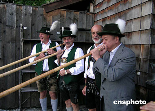 十三日傍晚﹐澳門特首何厚鏵結(jié)束了對(duì)德國巴伐利亞州一天的參觀訪問后來到阿爾卑斯山腳下游覽﹐當(dāng)?shù)厮嚾舜灯饌鹘y(tǒng)的阿爾卑斯號(hào)角歡迎客人。對(duì)長(zhǎng)長(zhǎng)的號(hào)角﹐眾人皆不得其法﹐只有何厚鏵信手拈來即能吹響。作者:孫兆震