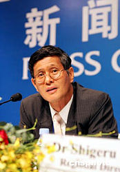 九月十四日,參加世界衛(wèi)生組織西太區(qū)委員會第五十五屆會議的專家和代表在上海繼續(xù)討論。圖為世衛(wèi)西太平洋辦事處主任尾聲茂晚間舉行記者會時表示,由于禽流感是農(nóng)村疾病,比SARS更難控制,所以對禽流感要做好最壞的打算。作者:潘索菲