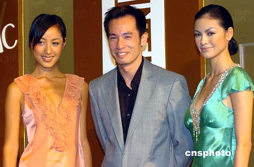 香港藝員陳豪(中)與名模蔣怡(左)﹑Rosemary14日出席香港時(shí)代廣場(chǎng)“時(shí)代b2”開(kāi)業(yè)儀式。