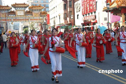 二零零四年華盛頓中國文化節(jié)九月十九日在華盛頓唐人街舉行。身著民族服飾的東方女子敲起腰鼓,別有風韻。 作者:余東暉