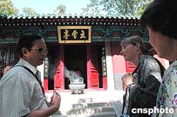| 九月二十一日,導(dǎo)游在剛剛竣工的少林寺立雪亭前給游客講解。中國嵩山少林寺整修工程近日竣工,過去僅能容納三千多人的少林寺整修后可同時接納一萬人游覽。今年三月份,鄭州市政府開始全面對少林寺進(jìn)行整修。整修內(nèi)容除包括擴(kuò)建青石廣場,寺院內(nèi)地面磚、消防通道等建設(shè)外,還恢復(fù)東西八座殿堂的歷史原貌以及殿宇樓閣的重新粉飾添彩等多項工程。這次少林寺整修工程共鋪設(shè)青磚地面近一萬平方米,恢復(fù)建筑面積一千六百平方米,新建東僧房建筑面積近一千五百平方米。作者:慎重