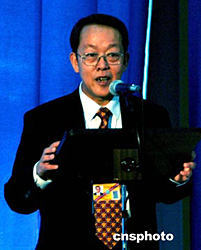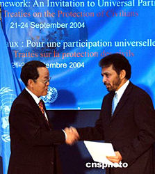 當(dāng)?shù)貢r間九月二十二日,中國常駐聯(lián)合國代表王光亞(左)在紐約聯(lián)合國總部向安南秘書長的代表交存了中國加入《聯(lián)合國人員和有關(guān)人員安全公約》的加入書。三十天后,該公約將對中國生效。作者:趙海燕