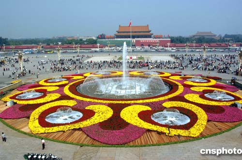 九月二十三日,北京市園林局在天安門廣場中央搭建的直徑72米的“萬眾一心”巨型噴泉花壇竣工。天安門廣場花壇總占地面積為12000平方米,用花總量約為30余萬盆。中新社記者:鄒憲