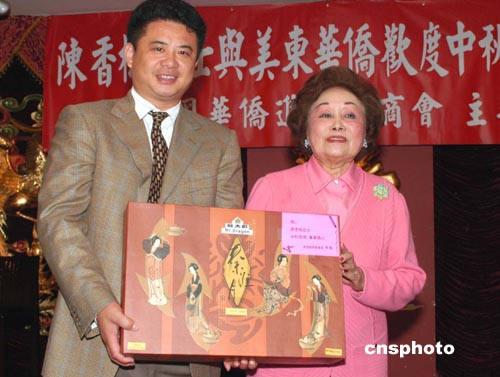 美東時間二十四日中午,著名美籍華人陳香梅從華盛頓趕到紐約,與美東華僑一起歡度中秋佳節(jié)。美國華商會會長鄧龍在聯(lián)誼會上向陳香梅(右)贈送精制的月餅。 龔文謨 攝