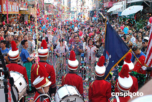 美東時間九月二十六日,紐約秋高氣爽。由“九一一”以后成立的繁榮華埠社主辦的慶中秋文藝燈節(jié)舉行,慶;顒訌闹形绯掷m(xù)到傍晚,華埠鑼鼓鏗鏘,獅龍競舞。作者:龔文謨