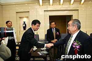 中國新聞社總編輯郭招金和九屆全國人大副委員長布赫親切握手