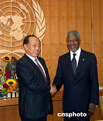 當(dāng)?shù)貢r(shí)間九月二十七日,正在紐約聯(lián)合國總部出席第五十九屆聯(lián)大的中國外長李肇星與聯(lián)合國秘書長安南會晤,雙方就聯(lián)合國作用、改革和發(fā)展以及蘇丹達(dá)爾富爾等問題交換了看法。作者:趙海燕