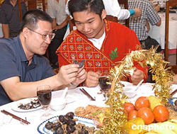九月二十七日晚,來自近三十個(gè)國家和地區(qū)的一百多名華裔留學(xué)生聚集在廣州荔灣湖畔的泮溪酒家,參加廣東省僑辦舉辦的中秋聯(lián)誼會(huì),品嘗有名的“廣州泮塘五秀”——菱角、馬蹄、蓮藕、茨菰、茭筍。圖為華裔留學(xué)生在學(xué)習(xí)食用方法。作者:羅仰明