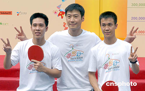歌星黎明(中)與奧運乒乓球男子雙打銀牌得主高禮澤(左)、李靜9月28日在香港出席「公益金便服日」突破紀錄儀式,大會并舉行乒乓球友賽,賽后黎明與香港「乒乓孖寶」合照。