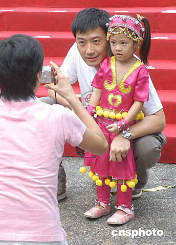 歌星黎明9月28日在香港出席「公益金便服日」突破紀錄儀式,與為活動擔任表演的小朋友合照。