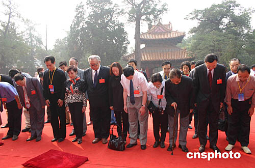 專程從海外趕來的孔子海外后裔,在大成殿前集體祭拜先祖。作者:鞠成利