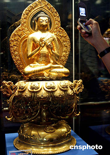 珍寶館是北京故宮博物院重要的常規(guī)陳列之一,以鐘表館一道以展示最具清代宮廷韻味的文物珍品為主。改陳后的珍寶館以保護(hù)文物、突出文物、盡量體現(xiàn)文物的自身價值及審美價值為原則,在整體環(huán)境設(shè)計上,以乾隆時期為依據(jù)。圖中展出的是金釋迦牟尼像。中新社記者:張勤