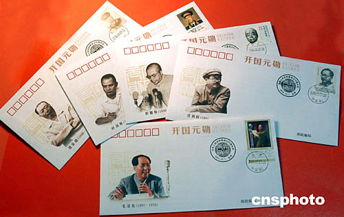 | 在慶祝中華人民共和國(guó)成立五十五周年之際,中國(guó)郵票博物館九月二十九日出品發(fā)行了一套十五枚《開(kāi)國(guó)元?jiǎng)住方佡|(zhì)紀(jì)念封!堕_(kāi)國(guó)元?jiǎng)住方佡|(zhì)紀(jì)念封其中印有毛澤東、周恩來(lái)、劉少奇、朱德、任弼時(shí)、鄧小平、陳云、彭德懷、劉伯承、賀龍、陳毅、羅榮桓、徐向前、聶榮臻、葉劍英等開(kāi)國(guó)元?jiǎng)椎纳顖D象和貼有相應(yīng)肖像郵票。這套絹質(zhì)紀(jì)念封也被收納在中國(guó)郵票博物館于當(dāng)日發(fā)行的《開(kāi)國(guó)元?jiǎng)住方疸y郵品典藏冊(cè)之中。中新社記者:鄒憲