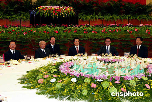 中國國家主席胡錦濤、全國人大常委會委員長吳邦國、國務院總理溫家寶、全國政協(xié)主席賈慶林等與柬埔寨西哈努克國王和王后出席招待會。