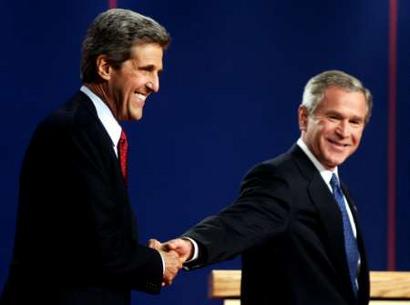 兩位候選人,一位是總統(tǒng),一位是參議員,皆出自富家名校,又都伶牙俐齒,在辯論場上也已身經(jīng)百戰(zhàn),不過,布什作為在任總統(tǒng),又在民意調(diào)查中小占上風,加上在伊拉克戰(zhàn)爭上、尤其在反恐工作中得到許多選民認可,他似乎只要在辯論中保持不敗即可站穩(wěn)腳跟。