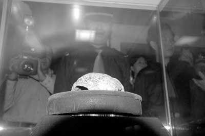 據(jù)北京娛樂信報(bào)報(bào)道,30日上午10時30分左右,在數(shù)名手持沖鋒槍的房山公安分局防爆隊(duì)隊(duì)員的嚴(yán)密監(jiān)視下,北京人頭蓋骨枕骨化石從中科院安然運(yùn)抵周口店北京人遺址博物館,被安放在防彈玻璃罩中展出,這次展出將持續(xù)到10月14日。