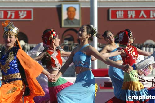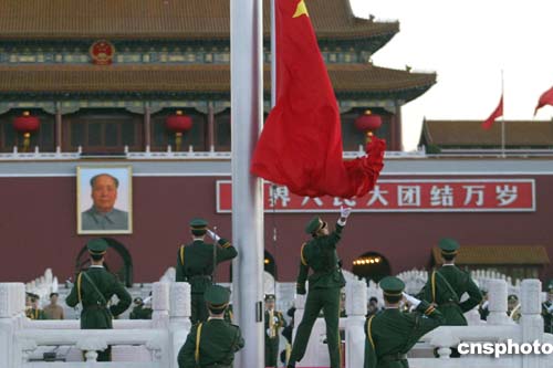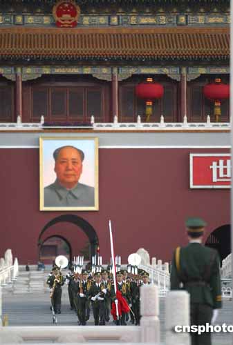 二○○四年十月一日,北京天安門(mén)廣場(chǎng)舉行了隆重的國(guó)慶升旗儀式,慶祝國(guó)慶五十五周年。中新社記者:盛佳鵬