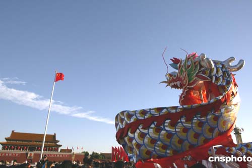 而另一位表情同樣親和的偉人,孫中山先生,其像在城樓對(duì)面廣場(chǎng)上矗立。來(lái)自北京各高校及其他各界人士,此時(shí)正在廣場(chǎng)歡歌起舞。一小時(shí)半前,他們剛剛在此觀看了升旗儀式。那一刻,近處奧運(yùn)倒計(jì)時(shí)器的顯示為一千四百零七天十二小時(shí)零五十一分鐘。