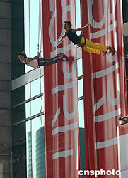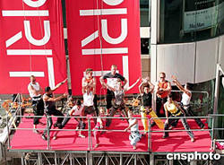 穿上時(shí)尚品牌ESPRIT 2004秋冬運(yùn)動(dòng)時(shí)裝的模特,10月4日在香港尖沙咀美麗華商場外墻舞臺(tái)上表演,展示優(yōu)美姿態(tài),為該品牌運(yùn)動(dòng)系列宣傳。作者:洪少葵