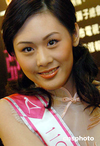 圖為選自香港的候選佳麗黃淑玲在發(fā)布會(huì)上展示風(fēng)采。