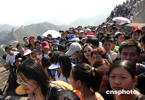 “十一”黃金周期間,大批游客擁擠在北京八達嶺長城上寸步難行。黃金周期間,北京故宮、八達嶺長城等景區(qū)接待游客連續(xù)多日呈飽和狀態(tài)。北京全市在整個黃金周共接待國內(nèi)游客達406萬人次。中新社記者:張煒