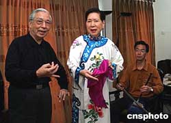 年過七旬臺灣人申陳曼麗女士(中),新近落戶上海,并在家中學(xué)京劇一絲不茍,“家教”老師是京劇大師梅蘭芳的入室弟子舒昌玉(左)。十月八日,申陳曼麗將在上海逸夫舞臺舉行自己的演出專場,上演梅派名劇、全本《玉堂春》。這位海外京劇名票粉墨登場,吸引上海眾多戲迷捧場。作者:潘索菲