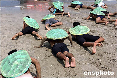 在一次保護當?shù)厣鷳B(tài)環(huán)境的抗議活動中,動物權(quán)利保護組織成員裝成海龜,在巴厘島的庫他海灘上爬行。