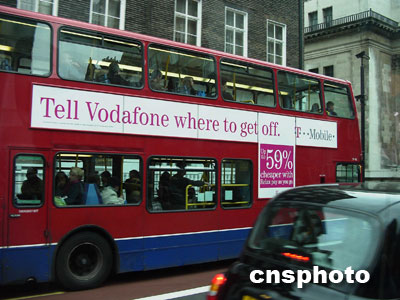 倫敦公交車車身上,赫然出現移動通訊運營商直接點名挑戰(zhàn)對手的廣告。余瑞冬 攝