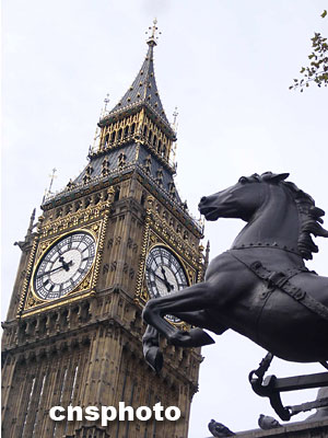 圖為倫敦的標(biāo)志之一——大本鐘(Big Ben)。畫(huà)面前方是西敏橋(Westminster Bridge)西側(cè)的戰(zhàn)馬雕塑。余瑞冬 攝