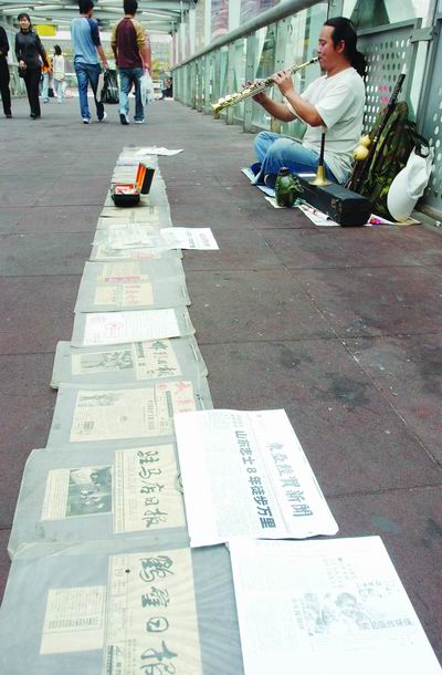 他面前的地上除了用來賣藝的薩克斯管、巴烏、嗩吶、笛子和葫蘆絲,還有20多份攤在地上的報紙剪報,剪報的內(nèi)容全都是包括《華西都市報》《重慶晚報》在內(nèi)的山東、四川等地地方報紙對他的相關(guān)報道。