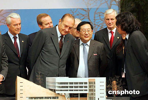 演講之前,希拉克出席了中法中心的奠基儀式。他一邊聽講解,一邊仔細觀看了即將破土動工的中法中心模型。他在演講中說,很高興能夠參觀中法科技創(chuàng)新中心的建筑模型,并稱之為中法合作精神的重要體現(xiàn)。