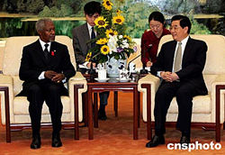 組圖:胡錦濤會(huì)見(jiàn)聯(lián)合國(guó)秘書長(zhǎng)安南