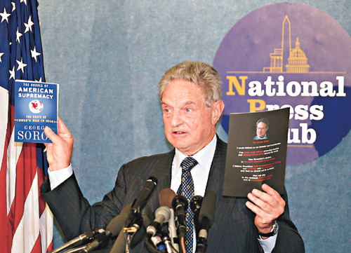 索羅斯除了捐款給其它反布什團(tuán)體,自己也斥巨資登廣告出書(shū)及巡回演講呼吁選民推倒布什,估計(jì)他個(gè)人為這次大選最終要花二千五百萬(wàn)美元。這是索羅斯第一次公開(kāi)大規(guī)模介入美國(guó)選舉。他在其出版的一本反布什的書(shū)中說(shuō),布什政府中的強(qiáng)硬派正利用恐怖主義的威脅,來(lái)追求他們自己想維持美國(guó)軍事優(yōu)勢(shì)的目標(biāo)。“而這種追求,則會(huì)繼續(xù)引發(fā)抵制,啟動(dòng)惡性暴力循環(huán)”。
