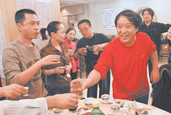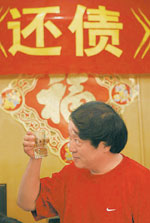 10日晚上,《還債》劇組舉行了開機宴,由于高速公路起霧,牛群從北京趕到石家莊的時候已經(jīng)是晚上8點鐘。當牛群一臉疲憊地出現(xiàn)的時候,他那已經(jīng)成為“攝影師、平民縣長”標志的馬甲并沒有穿在身上,而只穿了件紅色T恤和一件運動外套。讓記者感到第二個變化的是牛群的話少了,開機宴上男主角牛群自然少不了講話,人們滿懷期待他能夠講出如相聲般的精彩話語,可牛群只說了兩句客套話便沒了下文,在給各桌敬酒的時候他的話更少,只是端一下酒杯而不開口。