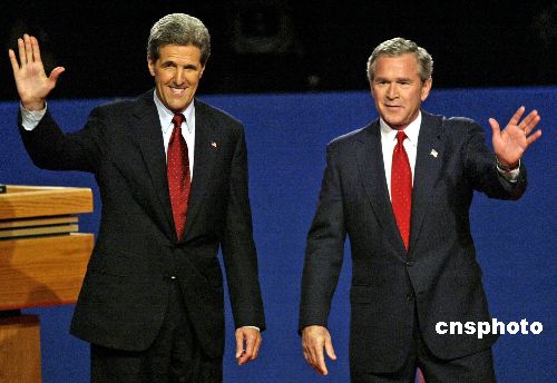 中新網(wǎng)10月14日電 美國總統(tǒng)候選人第三場辯論于美東時間13日晚9點在亞利桑那州立大學(xué)展開。由于是投票日前的最后一場辯論,布什與克里都將全力抓住這次給全國選民留下深刻印象、宣講施政方針、全面攻擊對方的最重要機(jī)會。