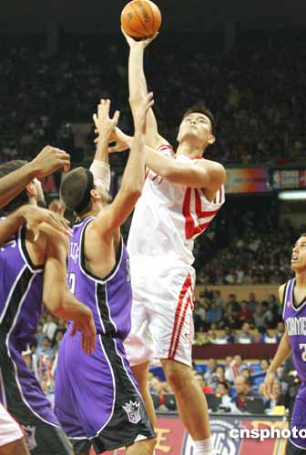 中新網(wǎng)10月14日電 今天晚上在上海舉行的NBA中國賽中,火箭隊以88-86擊敗國王隊,姚明在26分鐘內(nèi)拿下14分。