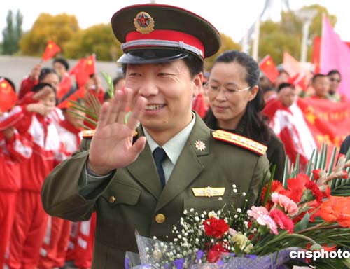 圖為楊利偉抵達(dá)航天員公寓時(shí)受到熱列歡迎。中新社記者:孫自法