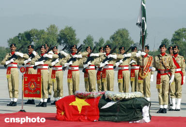 巴基斯坦禮兵抬著王鵬的靈柩走向?qū)C