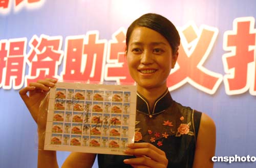 “神舟”五號飛船搭載紀念郵票將于今年年底在成都拍賣,拍賣所得傭金將全部捐助西部教育事業(yè)。“神舟”五號搭載紀念郵票是隨“神舟”五號一起遨游太空的唯一三個整版,中國航天員楊利偉、聶海勝、翟志剛三人在郵票上親筆簽名。圖為禮儀小姐展示其中一個整版。作者:郭晉嘉