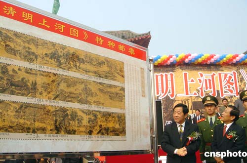 十月十八日,《清明上河圖》特種郵票首發(fā)儀式在河南開封清明上河園舉行!肚迕魃虾訄D》特種郵票是依據(jù)北京故宮博物院珍藏的中國北宋著名畫家張擇端的《清明上河圖》原作設計的。該郵票是中國郵票從一八七八年開始發(fā)行迄今為止最為精美的一套古代名畫郵票,也是中國郵票發(fā)行史上選題宏大、具有很高收藏價值的一套郵票。作者:何曉聰