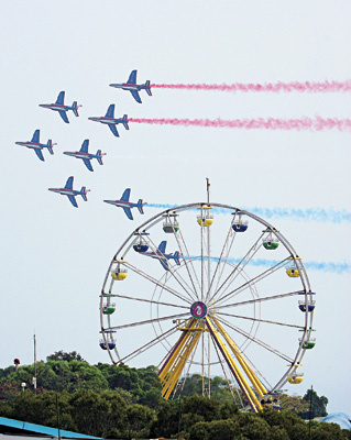 擔(dān)任特技表演的八架阿爾法戰(zhàn)機(jī),在港島海面上空排列出菱形、雁行、箭形及十字形等不同隊(duì)型,并不斷做出空中翻跟斗、急轉(zhuǎn)彎、突然分散及對(duì)飛等被人形容為“空中芭蕾”的連串高難度花式表演動(dòng)作。表演中飛機(jī)尾部噴灑出象征法國(guó)國(guó)旗的紅、白、藍(lán)三種彩色煙霧,在空中形成美麗的圖畫。約半個(gè)小時(shí)的精彩特技飛行引得香江觀眾陣陣歡呼和贊嘆。