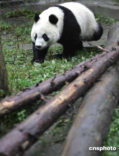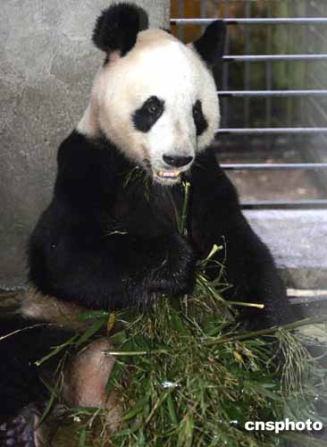 到四川臥龍安家的三只北京動物園大熊貓經(jīng)過一夜的睡眠后,十二歲的“迎迎”開始在新家享受新主人送上的鮮嫩竹子等美餐。作者:任晨鳴