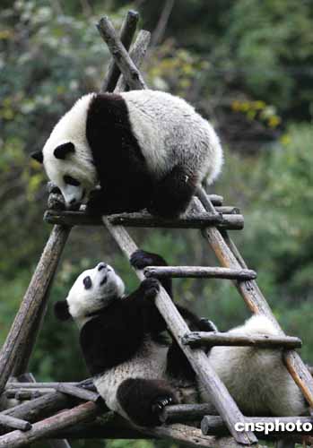 10月21日上午,四川臥龍大熊貓保護中心年滿周歲的大熊貓“瑛華”(中),絲毫沒有離家遠行前的惆悵,與往常一樣同小伙伴玩耍。作者:任晨鳴