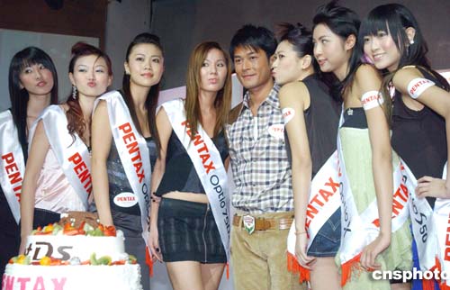 歌影紅星古天樂10月21日在香港出席PENTAX 2004 賓得數(shù)碼相機(jī)發(fā)布會,是日適逢古天樂生辰,七位賓得數(shù)碼女郎向古天樂吻賀。作者:鄧慶樂
