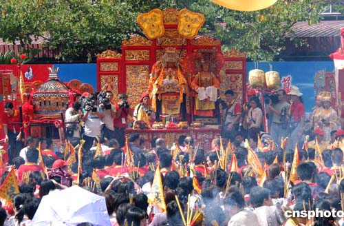 二十三日,湄洲媽祖金身座駕在護(hù)駕、儀仗隊和彩旗隊等的簇?fù)硐拢捎訚h公園出發(fā)巡安至媽閣廟前地,沿途穿插各項文藝表演增添氣氛。澳門眾多信眾紛紛前往向湄洲媽祖金身上香祈福。作者:梁永強